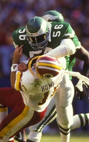 WASHINGTON – OCTOBER 1: Byron Evans #56 of the Philadelphia Eagles makes a sack during a NFL football game against Stan Humphries #17 of the Washington Redskins on October 1, 1990 at RFK Stadium in Washington D.C. (Photo by Mitchell Layton/Getty Images)