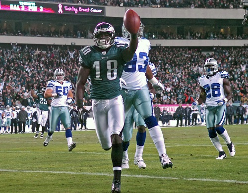 October 30, 2011; Philadelphia, PA USA; Philadelphia Eagles wide receiver Jeremy Maclin (18) scores a touchdown on a 12-yard catch during 1st quarter against the Dallas Cowboys at Lincoln Financial Field. Mandatory Credit: Eric Hartline-US PRESSWIRE
