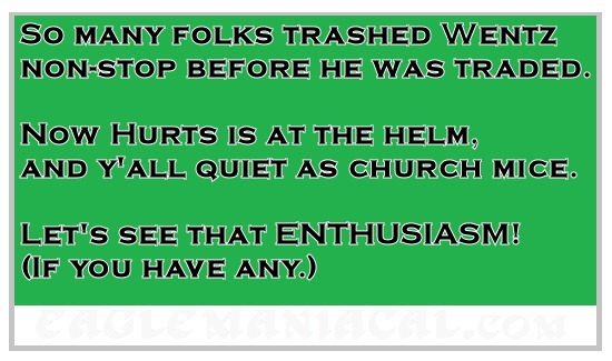 Now don’t get me wrong. I understand not tipping your hand, but to say nothing? Are they telling us that no one, has an encouraging word for presumed starting QB Jalen Hurts? Are they telling us that “Where Are They Now?” articles are more important than “This Year’s Break-out Player Will Be” articles?