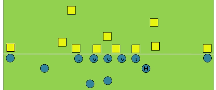 For those who don’t know, an H-Back is essentially a TE/FB hybrid. Where as an in-line (regular) TE lines up on the line of scrimmage next to the Offensive Tackle, an H-Back lines up behind the line of scrimmage (like a FB). Often a yard or so behind the Tackle, but he can be lined up anywhere back there. And that’s the point.