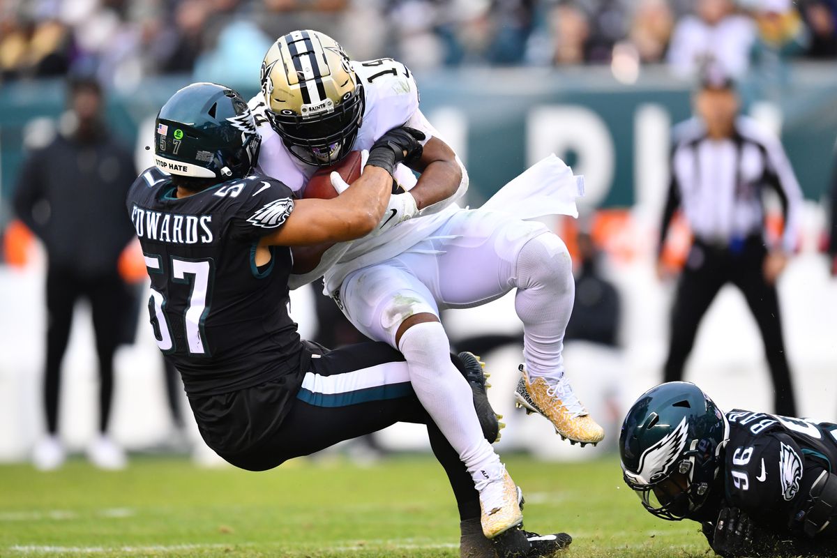 1) The T.J. and Nakobe Show: The national media predicted that MLB T.J. Edwards would lose his starting spot to rookie LB Nakobe Dean. I on the other hand, repeatedly said not so fast. Well, Edwards is third in the NFC in tackles (109), and having a career year so far. Dean saw his first extended action last week, when LB Kyzir White went down, and Dean acquitted himself well, making 6 stops in just 15 snaps..