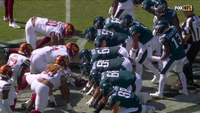 OG: LG Landon Dickerson is a bear in the run game, but he has to get the penalties under control. He’s been flagged 5 times (4 accepted for 24 yards). One of those however, was that bullshit offsides he was hit with against Washington, as the officials have joined in the hunt for finding a way to stop the Brotherly Shove. RG Cam Jurgen was great for three weeks, then suffered a foot injury and is currently on Injured Reserve. Filling in for Jurgens is Sua Opeta. He has not drawn any flags, but more importantly, this year he just looks more comfortable, and seems like a more physical presence. (Grade: B)