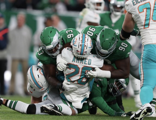 2) Set the Edges: The Eagles did a great job of this in the first half, as OLB Haason Reddick (4 – 0.0 – 0 – 0) was having none of it! Then in the second half, on back to back runs, they let the Dolphins get to the perimeter. After that, the Defense got their run game corralled, and limited the NFL’s #1 rushing attack, to 45 yards all night. (DONE)
