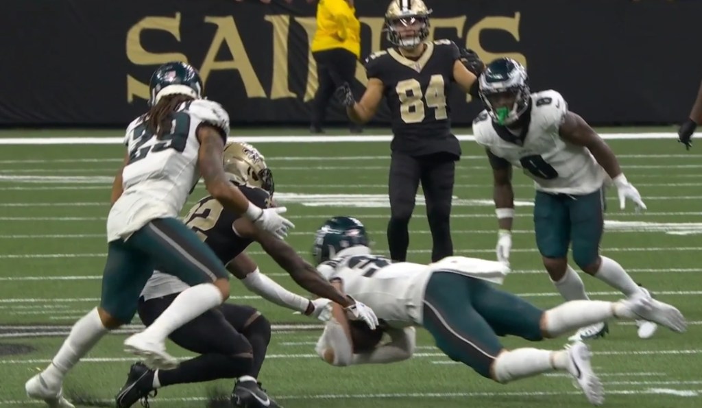 That natural boundary allowed our actual LB’s Zach Baun (11 – 0 – 0 – 0) and Nakobe Dean (8 – 0 – 0 – 0) to run cleanly to the play. Dean had a TFL, and Baun had a fourth down stop. The final result was the Eagles putting a muzzle on the Saints run game (29 – 89 – 3.0 – 0 – 0). (DONE)