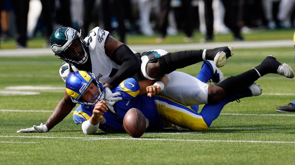 Whomever Mitchell ends up covering, may as well just stay home. Add to that the inside match-up of Cooper DeJean vs Cooper Kupp, and you can expect their statue of a QB to get caught holding onto the ball few times. Beat him up. Set the dogs on him.