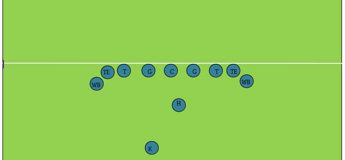 Because Special Teams is so rarely talked about, most people don’t know the positions. The five members of the line are T, G, C, G, T. That part you already knew. Outside of the T’s are the TE’s. Still pretty standard stuff. The players outside of the TE’s are Wing Backs (WB). Usually those are WR’s or RB’s who are good blockers, because the emphasis is on protection.